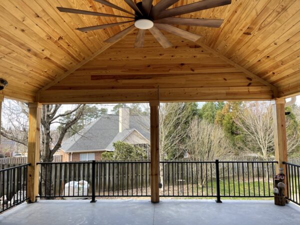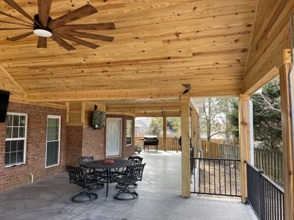 Covered patio with split faced block wall, concrete floors, and tongue and groove ceilings